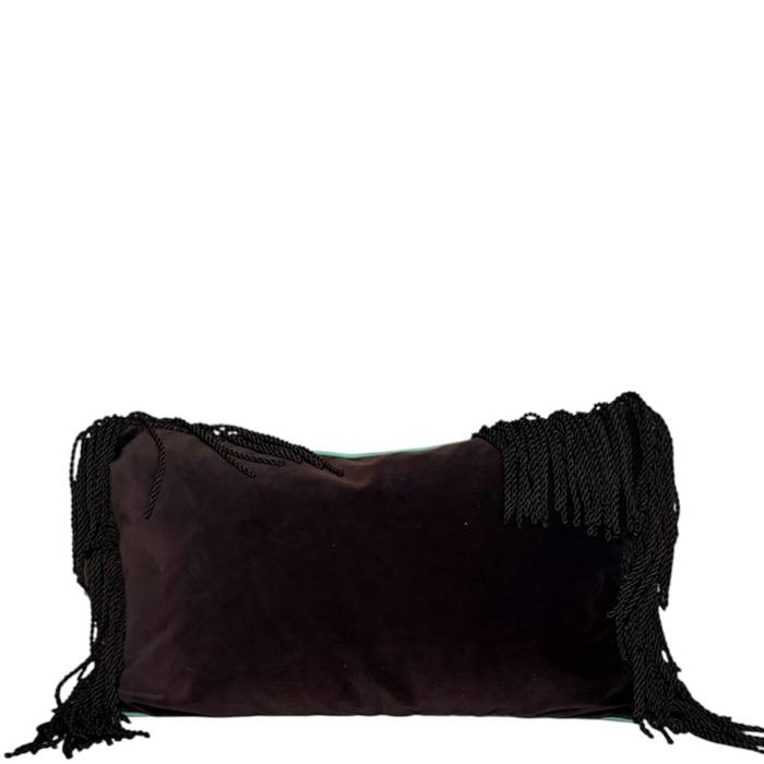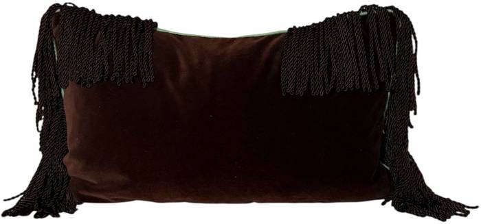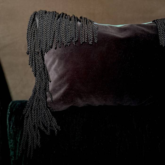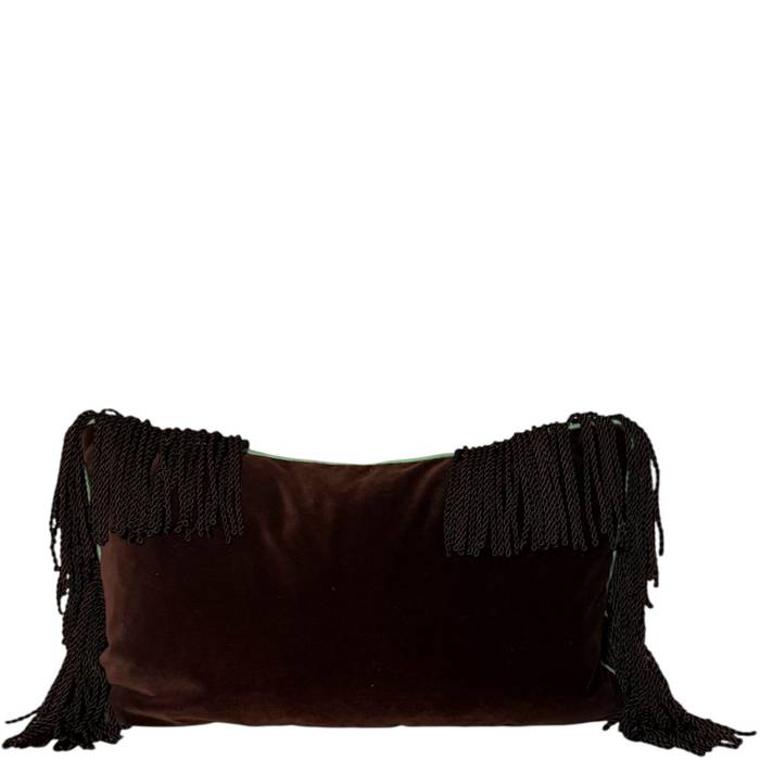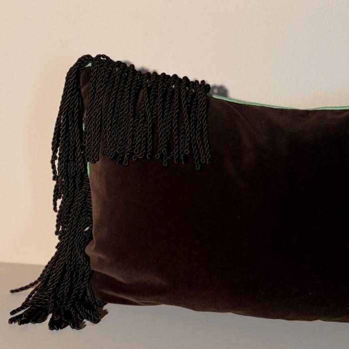 Premium cotton velvet from Lelievre trimmed with piping in green taffetas and a bullion fringe in the same dark brown shade as the velvet.