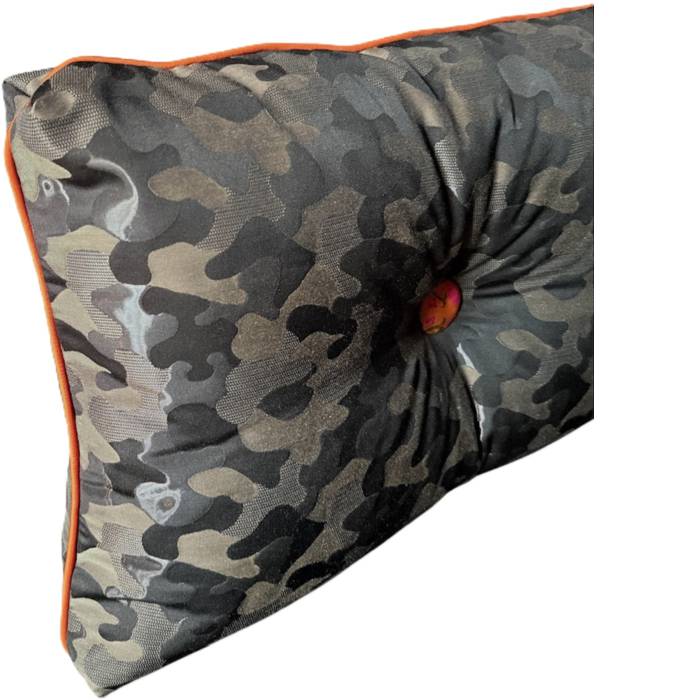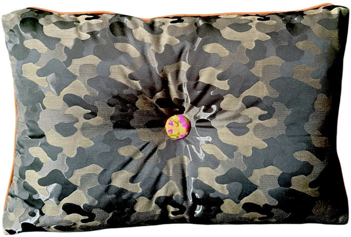 Made with a modern tech fabric featuring a camouflage pattern, central button in floral Thai silk and orange piping.