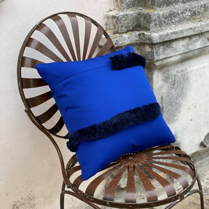 Bright blue plain fabric trimmed with dark blue marabou fringe. Note: Our outdoor pillows are made with suitable performance fabric and trim.