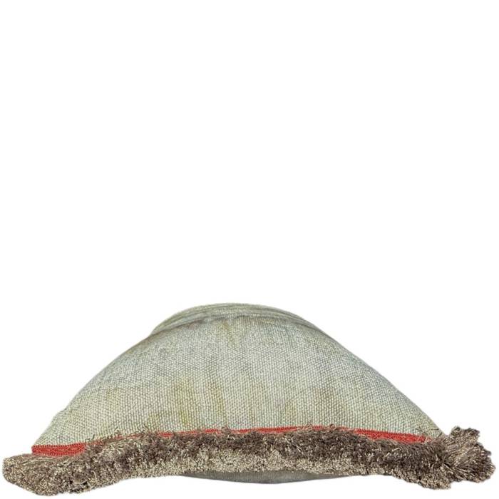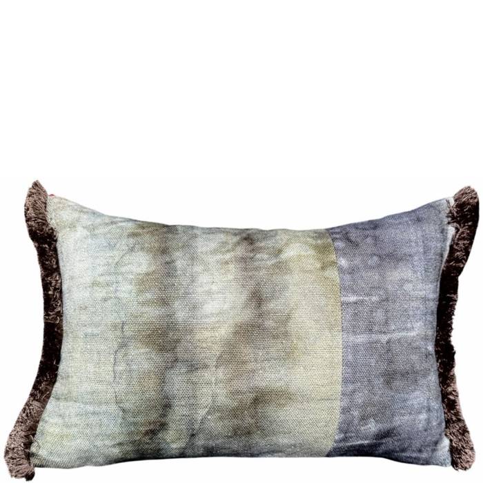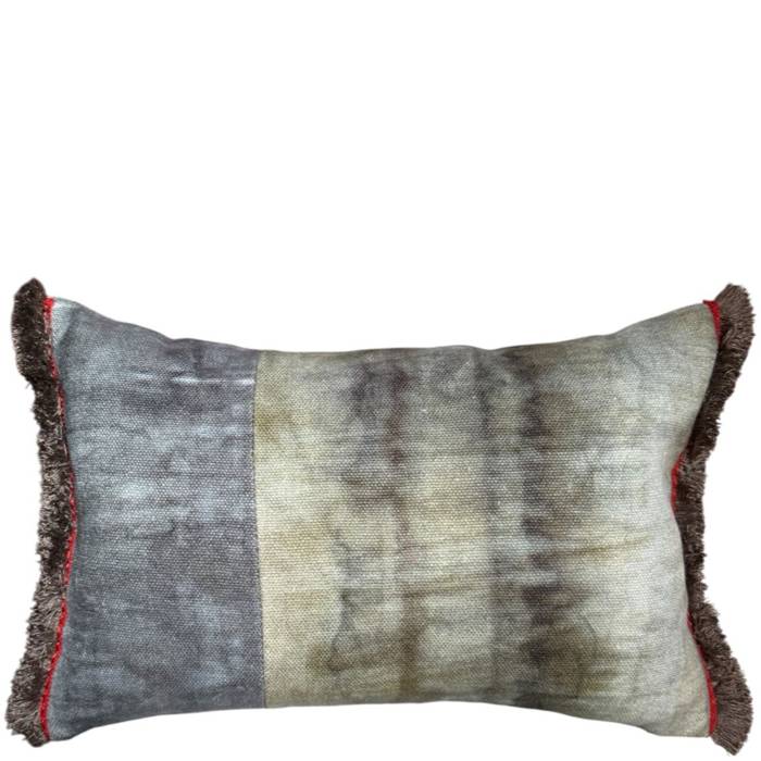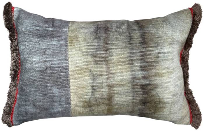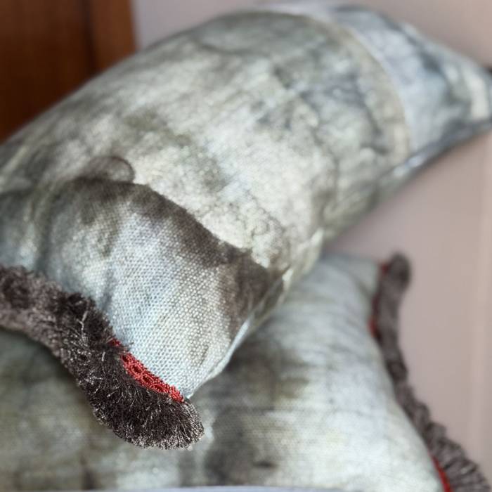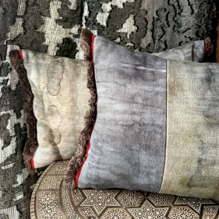 Yuval – featuring a premium linen fabric, printed with an aquarelle effect. We combined 2 different color ways and trimmed it with a neutral bronze marabou fringe and a small red jacquard trim along the front edge.