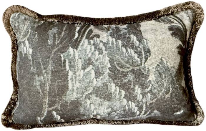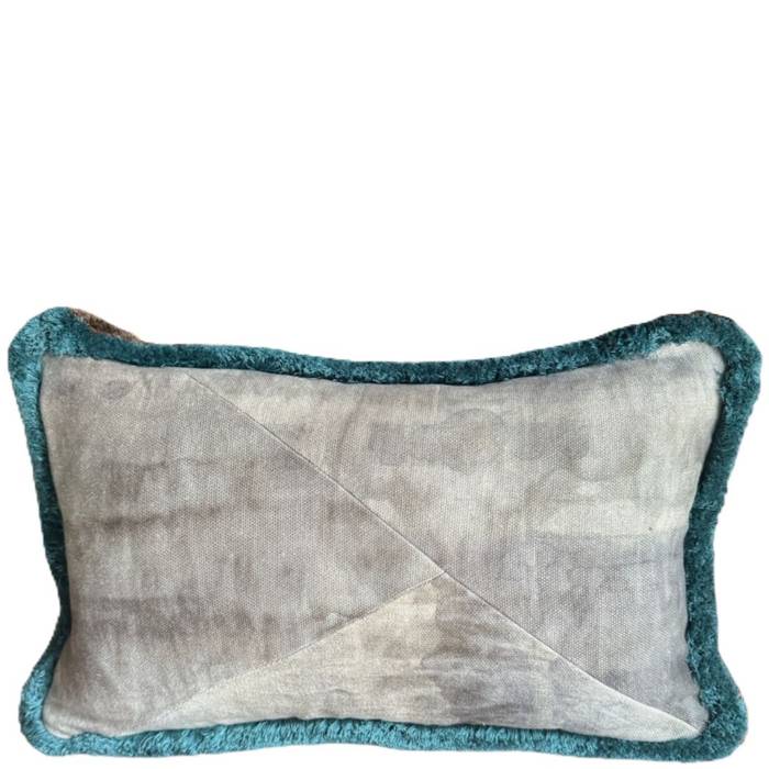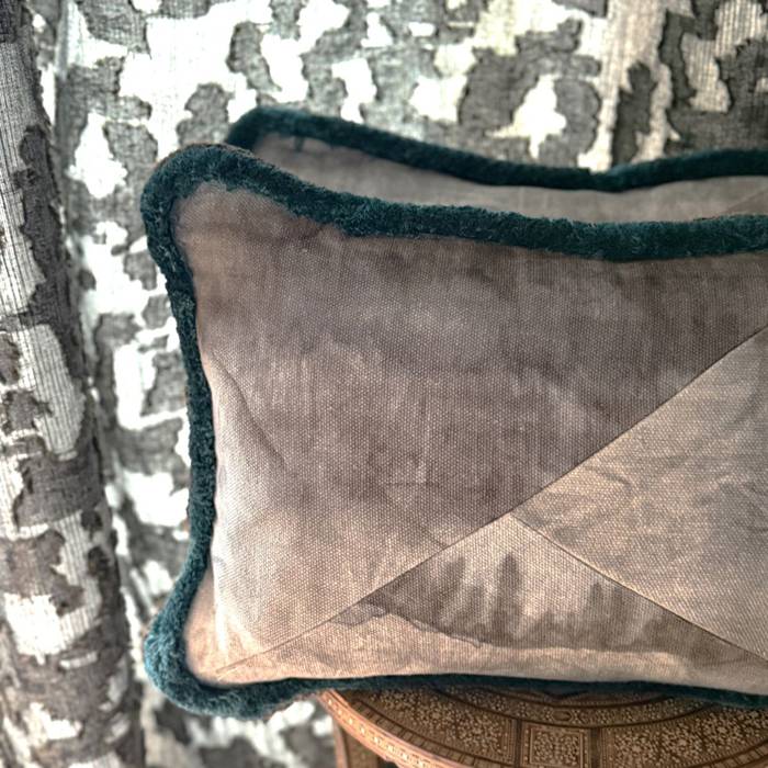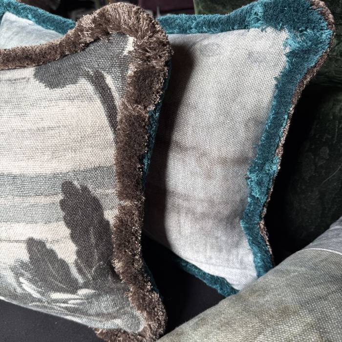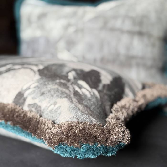 Yvain – featuring a premium linen fabric with a printed pattern, on one side with a monochrome tapestry, on the other an aquarelle effect composed in our signature style pattern Trimmed with a double marabout fringe in a neutral bronze shade and a rich teal.