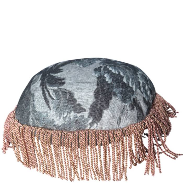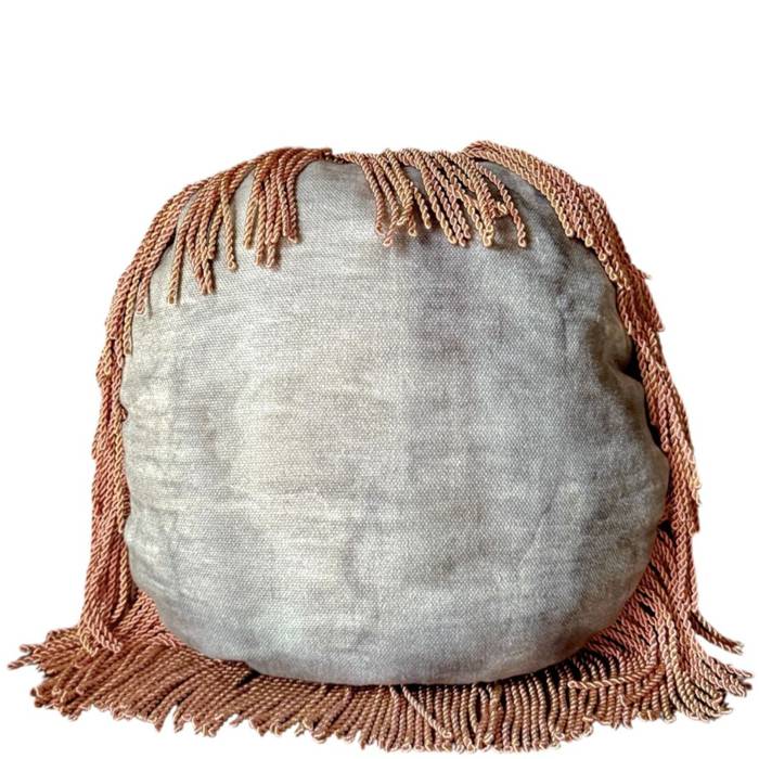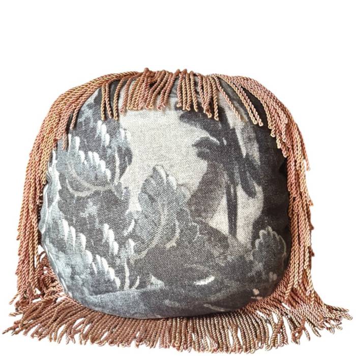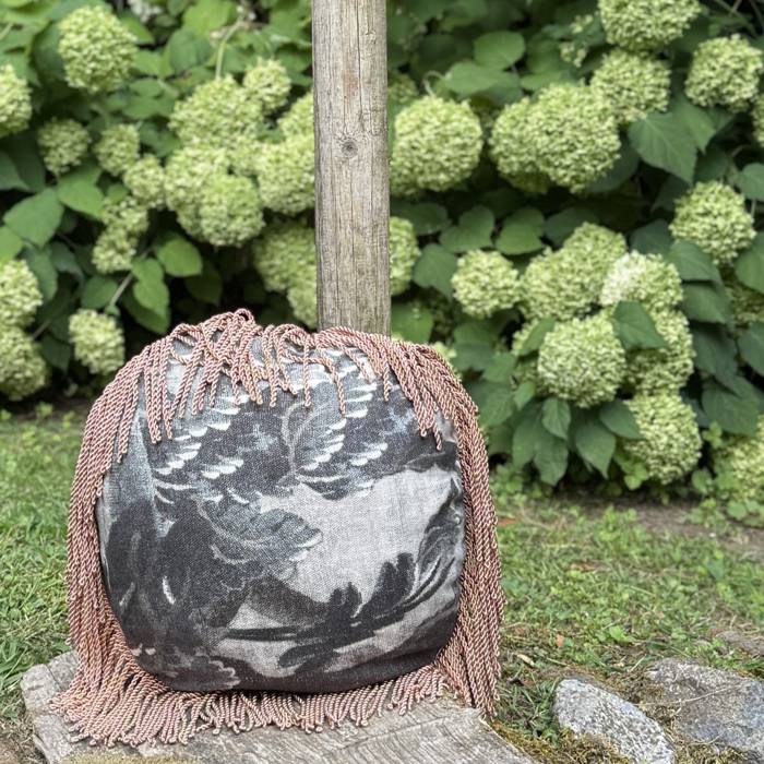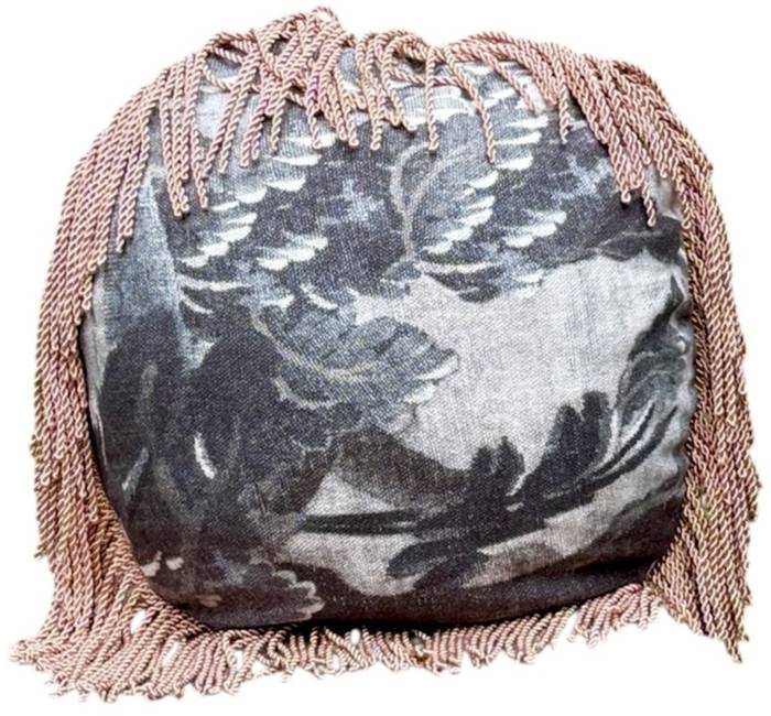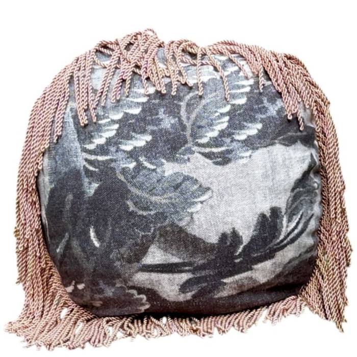 Yvonne – featuring a premium linen fabric with a printed pattern, on one side with a monochrome tapestry, an aquarelle effect on the back. Trimmed with a antique rose bouillion fringe